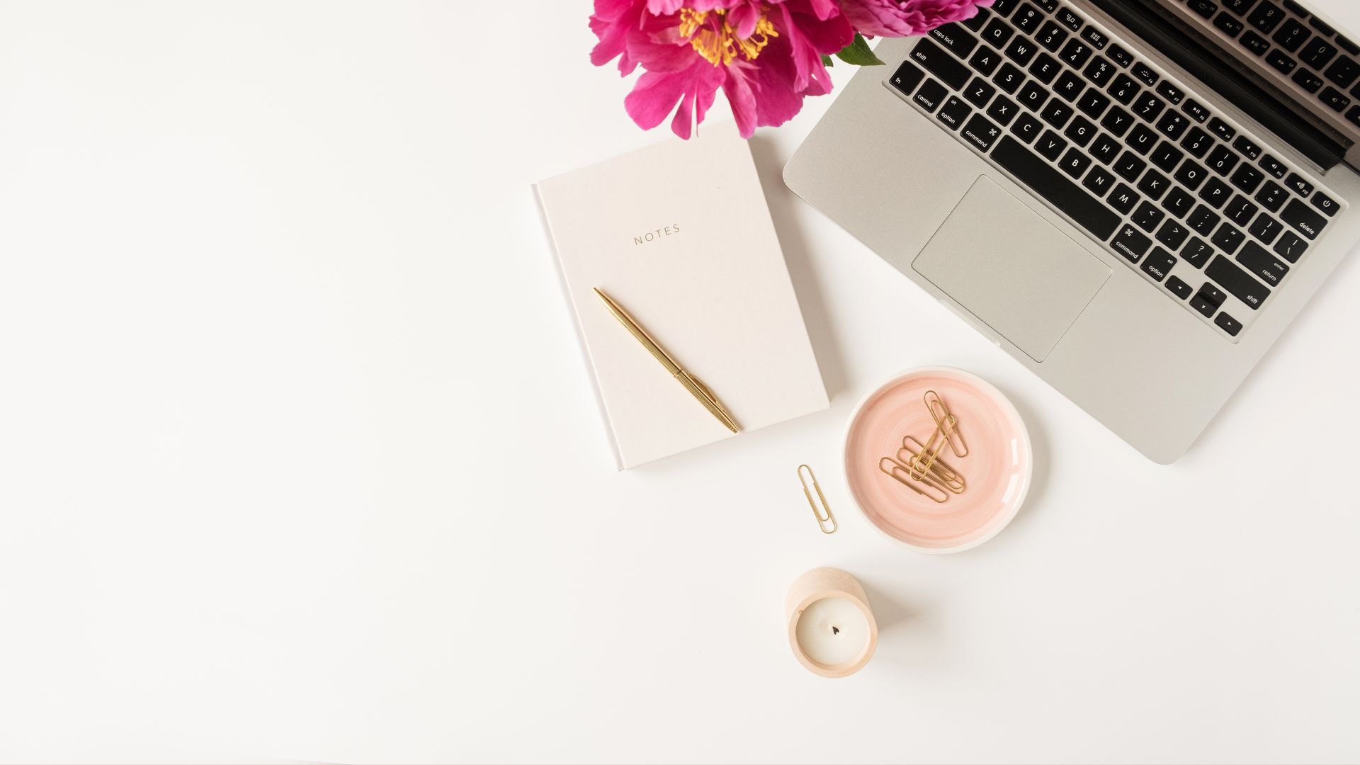 Home office desktop with laptop and notebook