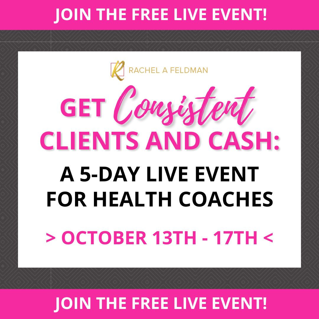 The Hottest Event of Q4 for Health Coaches! Are you ready to FINALLY attract consistent clients and boost your income without endless hustle or confusing strategies… in just 5 days? Join us October 13th – 17th for an exclusive event! Get Consistent Clients and Cash:A 5-Day LIVE Event for Health Coaches Get Consistent Clients and Cash: A 5-Day LIVE Event …