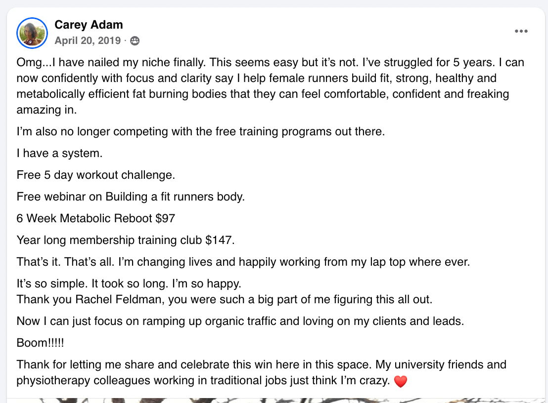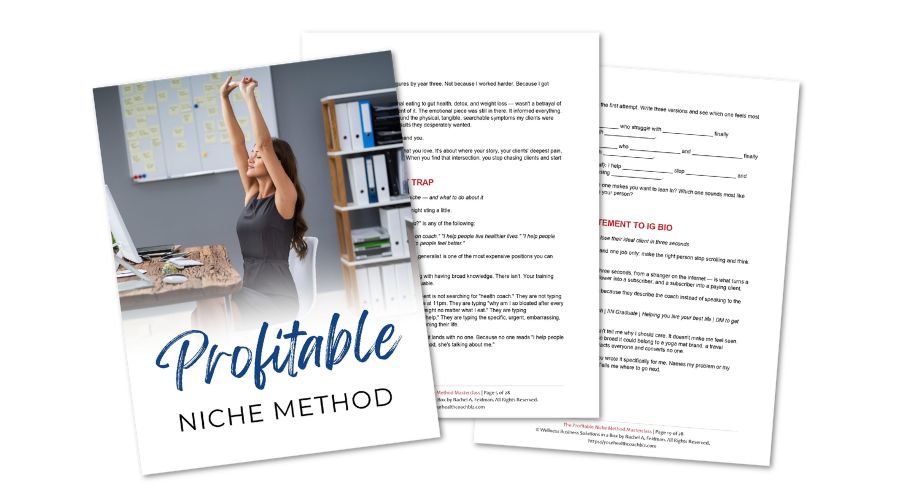 Rachel will walk you through exactly how she went from attracting the wrong clients as an emotional eating coach (fresh out of treatment and not healed enough to hold that space) to pivoting to gut health, food allergies, detox, and weight loss … because that was her real story, and more importantly, it was what her ideal clients were actually searching for. She’ll show you how she found the intersection of her story and the market and how you can do the same.